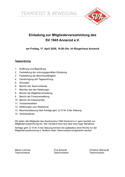 in diesem Jahr bekommt jedes Mitglied eine Einladung zur Mitgliederversammlung des SVA am 15.03.2024 um 20:00 Uhr im Bürgerhaus Annerod, da wir die Satzung des Vereins neu fassen wollen. Der Satzungsentwurf liegt wie auch die Tagesordnung für den 15.03.2024 diesem Schreiben bei. Der Vorstand würde sich über eine rege Teilnahme in diesem Jahr besonders freuen.