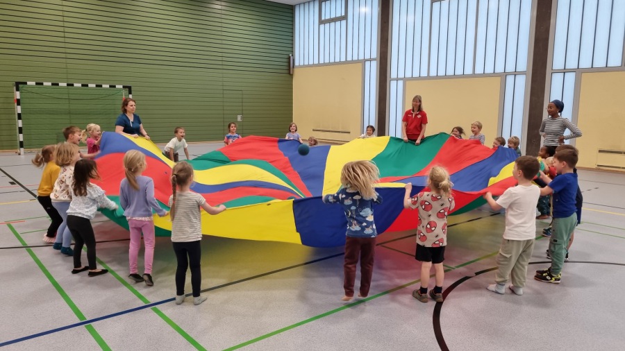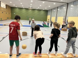 Balancieren, Ballwerfen, Blind führen, Ball in Kiste zielen beim Schwingen an den Ringen sowie Gemeinschaft am Schwungtuch.
